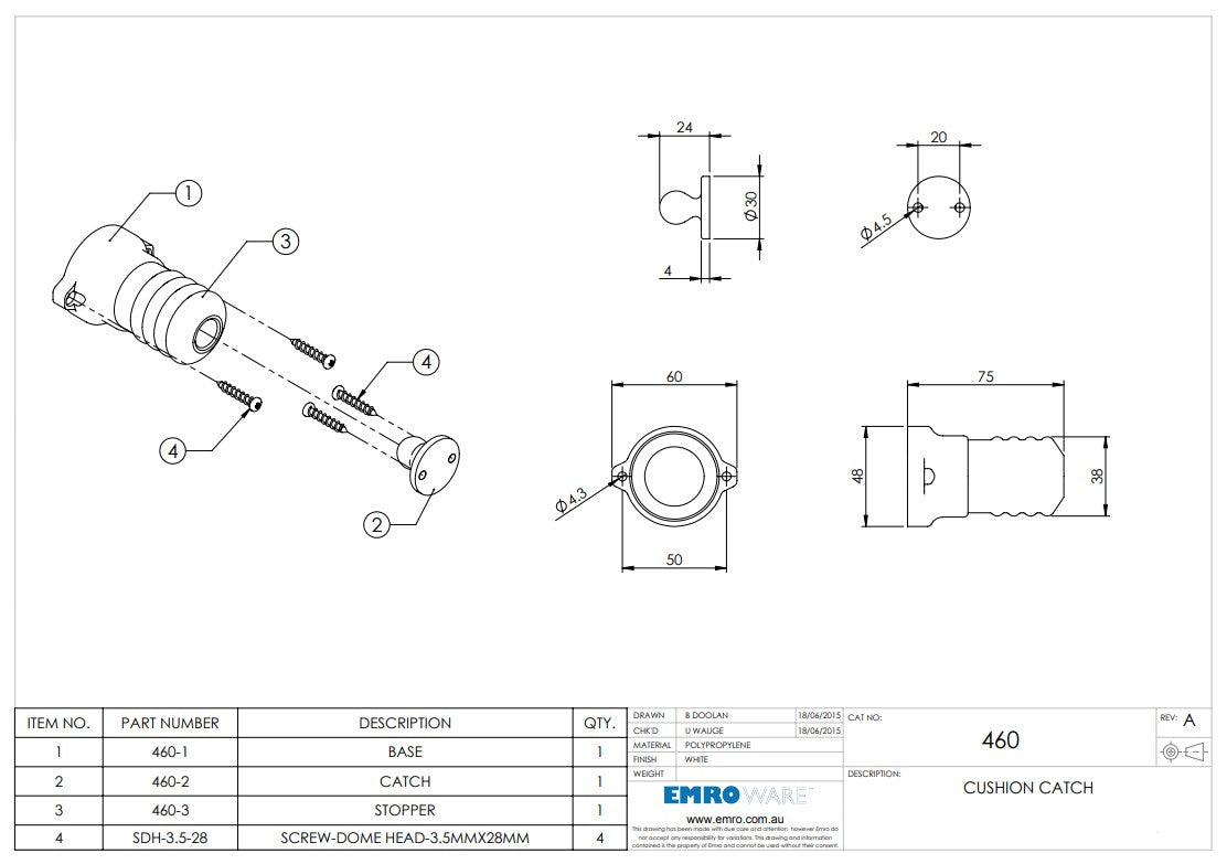 Secure your doors with EMRO’s Cushion Catch 460 – a durable, white polypropylene catch and stopper system designed for smooth, cushioned closure. This 4-piece set includes: